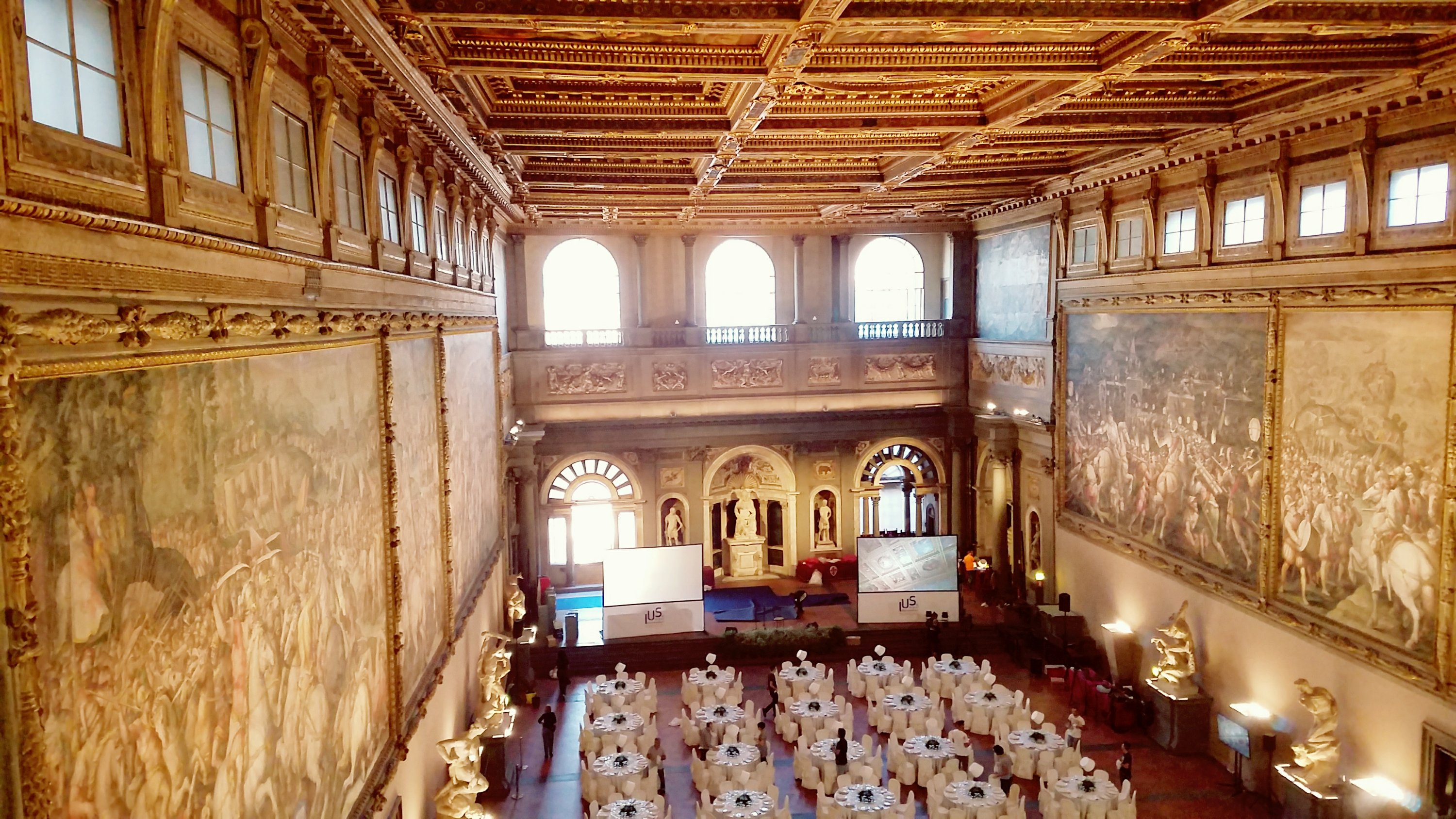 Here, magnificent paintings adorn the roof and the walls with work by Vasari and earlier work by Michelangelo and Leonardo da Vinci (now lost). This connects to the private rooms of the Medici family decorated with grand paintings mostly by Vasari and Boticelli.