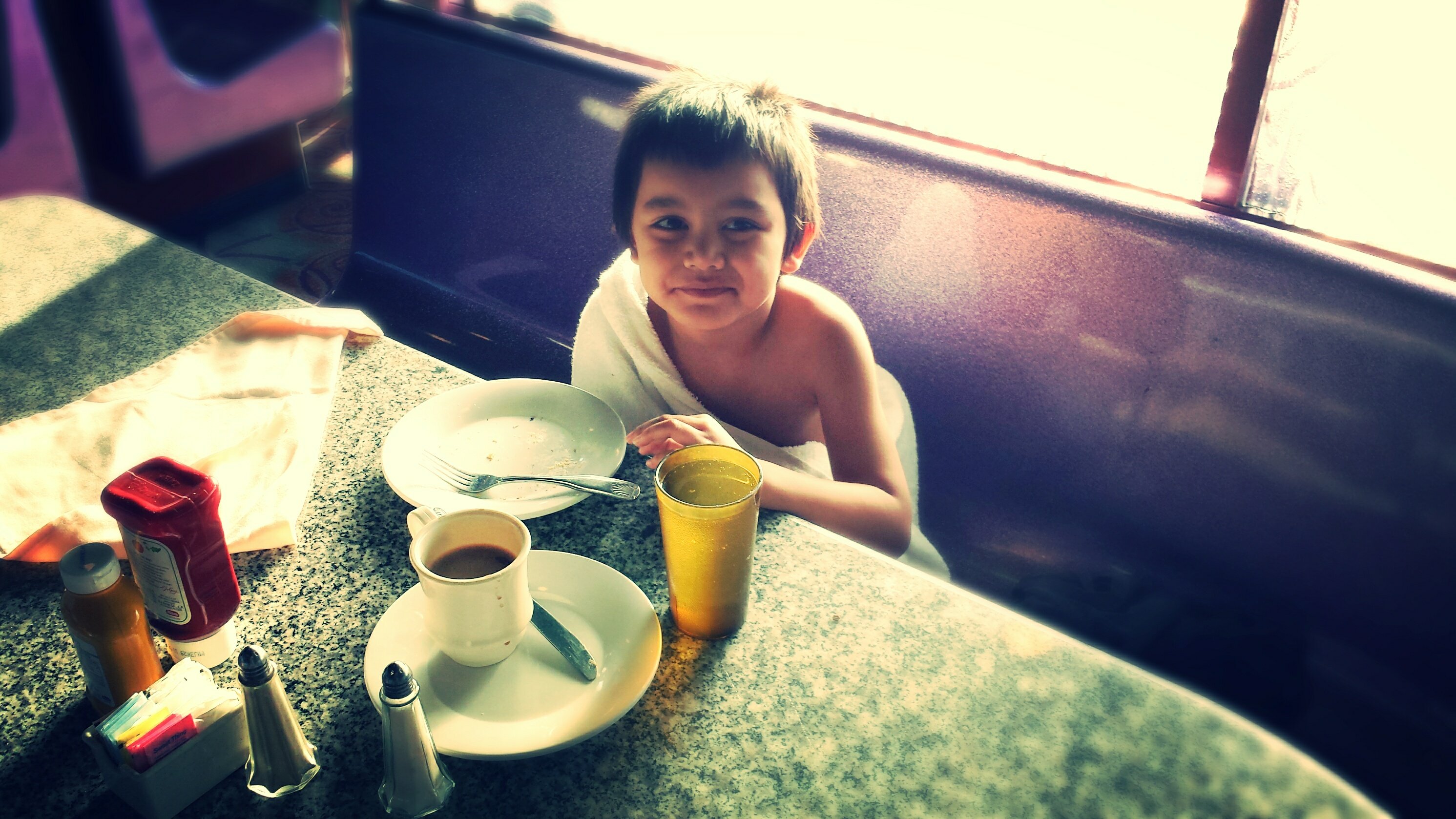 Zak having a grilled sandwich after a ride on the slipping slide!