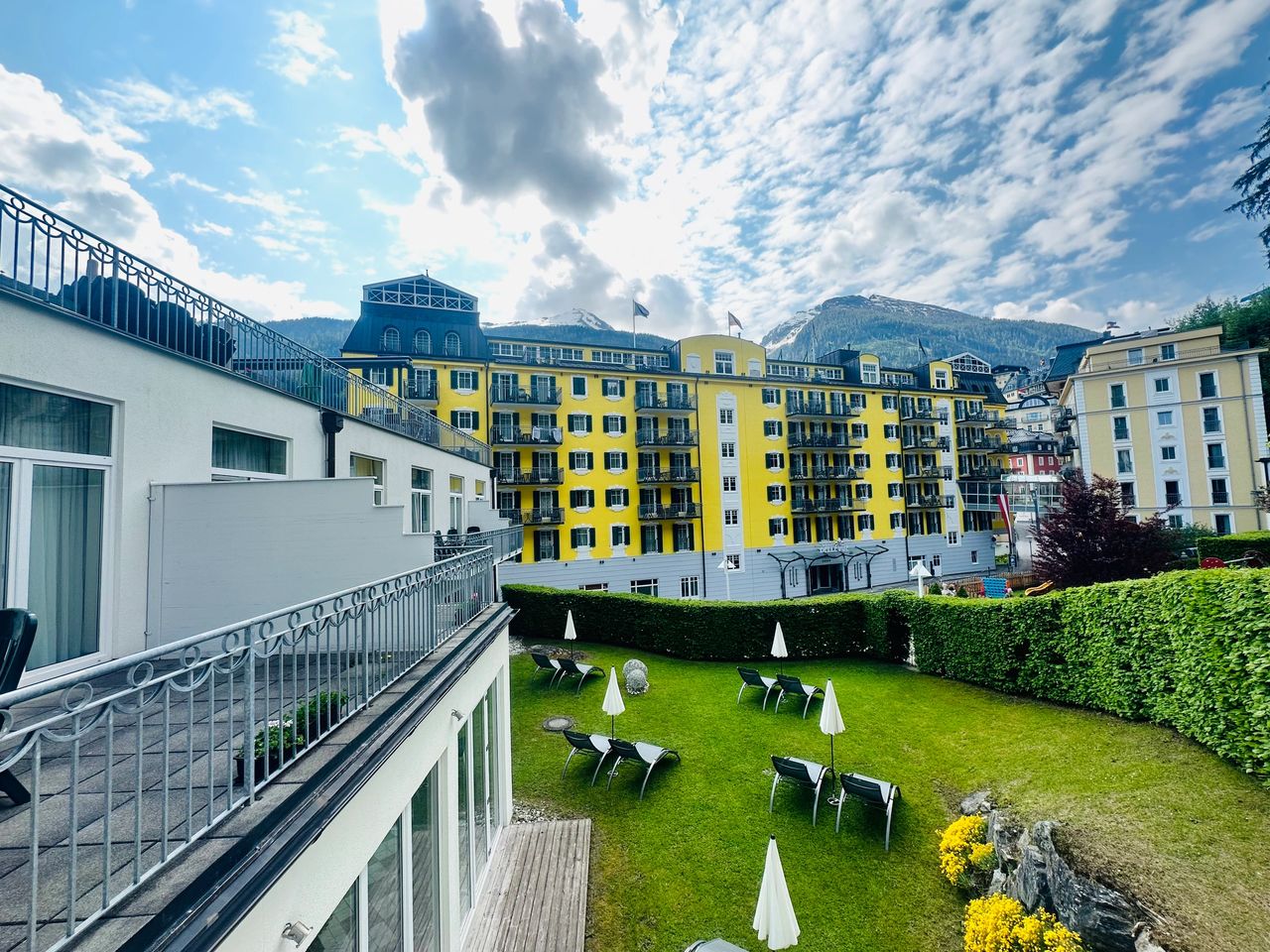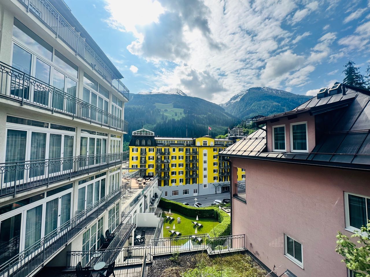 Mornings in our suite at the MONDI Hotel Bellevue Gastein were nothing short of magical. With a cup of coffee in hand, I found myself wandering from one window to another, my eyes feasting on the stunning views of the Bad Gastein mountainscape. My camera was on a photo frenzy, particularly with the sight of the Wes Anderson Grand Budapest-inspired hotel. Framed perfectly in my kitchen window, it stood like a majestic, centuries-old grand dame of the Alps.