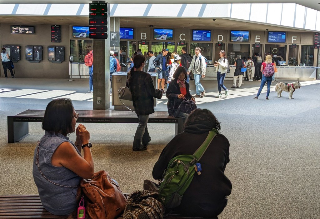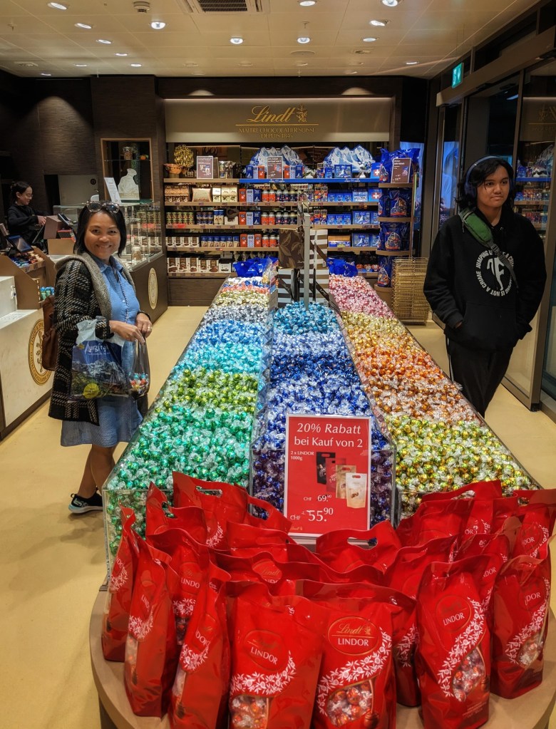 The descent to Grindelwald gives us a nice view of the village and surroundings. At the base of the cable car station visitors can treat themselves to a variety of famous swiss chocolate offerings.