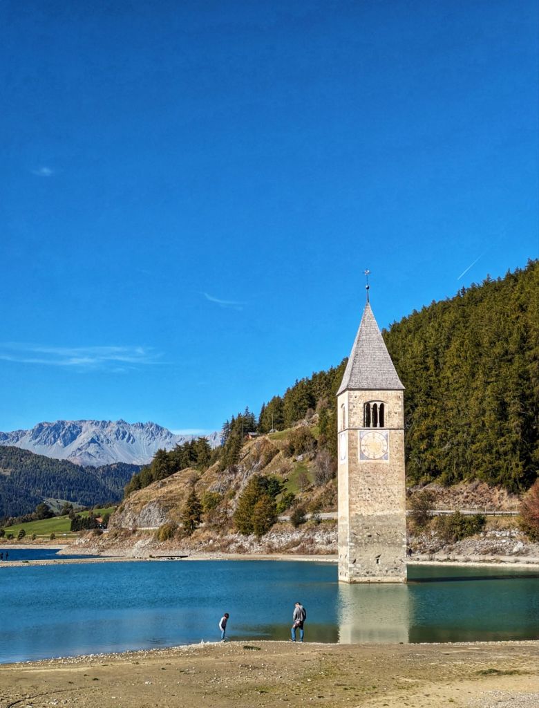 The church went under water when the valley was flooded to build an artificial dam, against the wish of many locals, in the late 1940s. However, the Church steeple rose above water level in recent decades, making the lake and its surroundings a tourist destination. The lake was prominently featured in the Netflix original Italian series “Curon”.