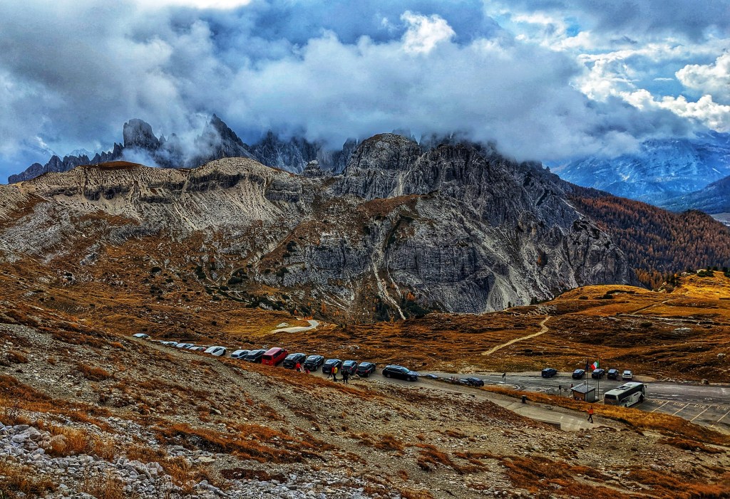 The most easily accessible support point around Drei Zinnen is Rifugio Auronzo (Auronzo hut, elevation: 2320 m). The cottage has good road connections to the tourist resort of Misurina (toll road) and part of the Tre Cime national park. Typical fee (2022 estimate) for cars and small vans is around 40 Euro for a whole day access. There are several levels of parking near the Rifugio. A narrow trail by the top parking lot offers shortcut into the wide hiking trail toward Rifugio Lavaredo and offers a great view of the surroundings.