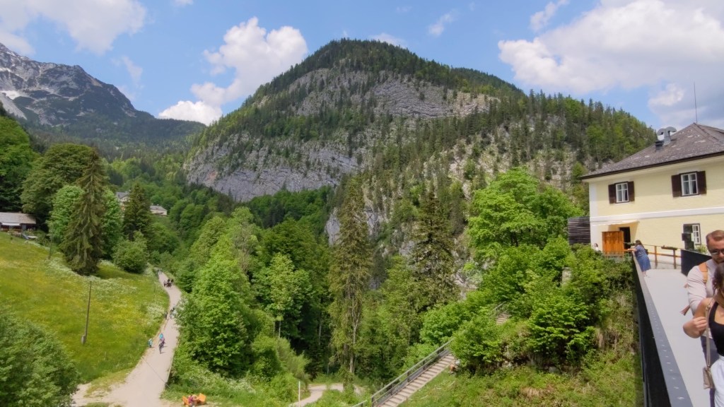 Though we had tickets for the salt mine adventure, unfortunately, time constraints prevented us from taking the tour. We’ve heard incredible things about delving into the mountain’s depths, exploring subterranean salt lakes, donning miners’ gear, and even whizzing down long wooden slides! It’s definitely on our list for a future visit. Emerging from the cool depths, we were greeted by the full, awe-inspiring vista from the top. It was a scene made for postcards: Hallstatt nestled along the lakeshore, a cluster of colorful houses framed by majestic Alpine peaks.