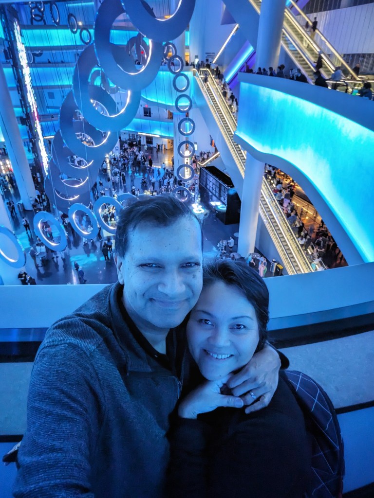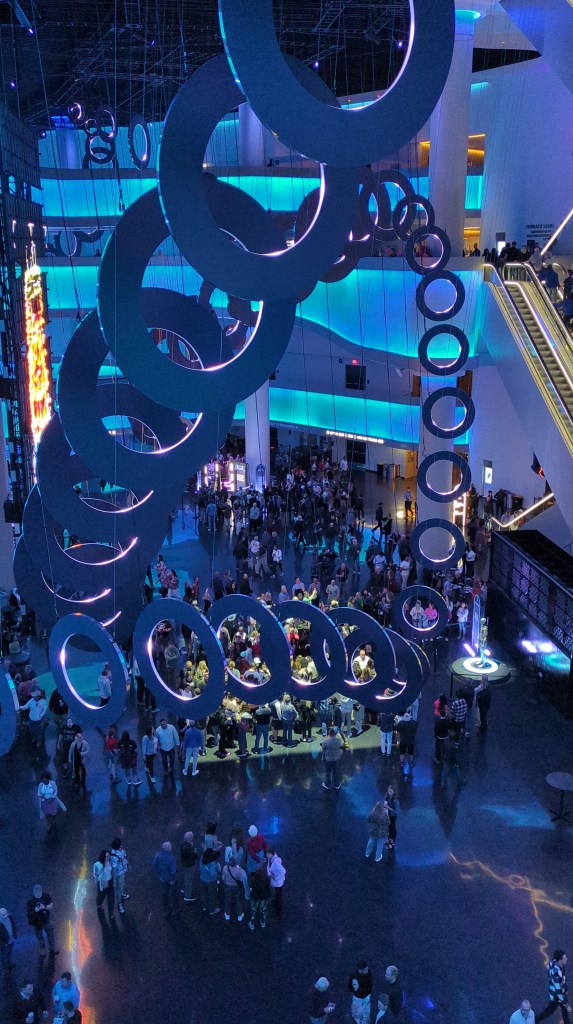 Entry inside the Sphere is ticket based and has limited capacity on an hourly basis. The Sphere interior exhibits are known for their immersive video and audio capabilities. Exhibits and cafes are spread around the interior leading up to the multi-level entrance to the auditorium at the top.