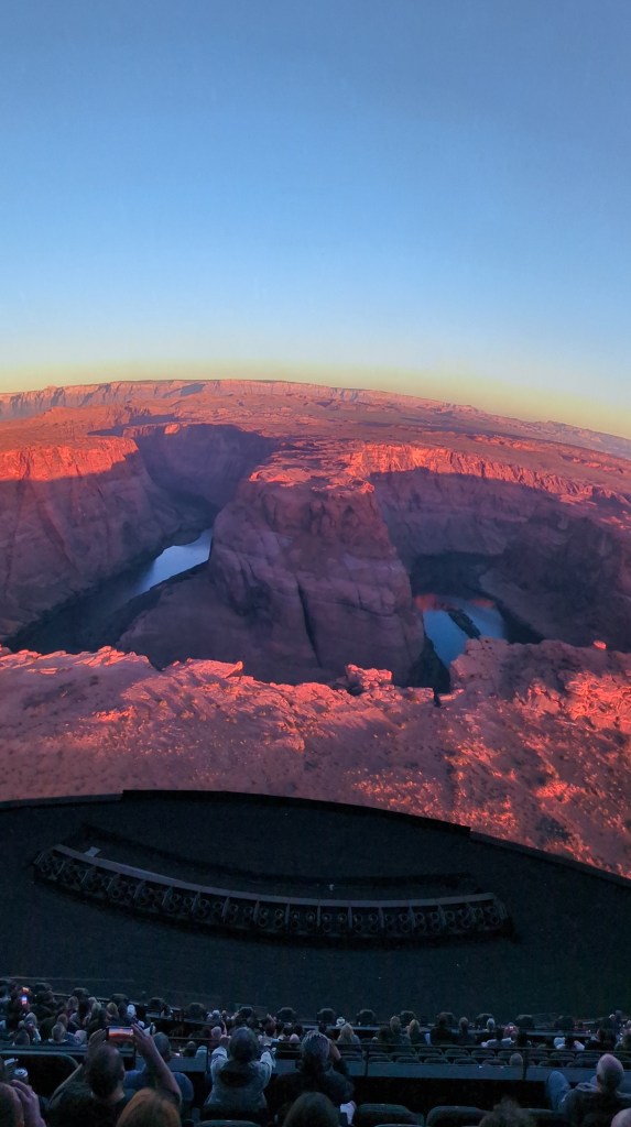 The main attraction of the Sphere is typically a live music event or 4D show at the auditorium. Sphere opened on September 29, 2023, with Irish rock band U2 beginning a 40-show residency called U2:UV Achtung Baby Live at Sphere. Director Darren Aronofsky’s docu-film Postcard from Earth opened on October 6, 2023. Below are a few images from the immersive experience of “Postcard From Earth” with a surrounding view that is unique for an auditorium of this size.