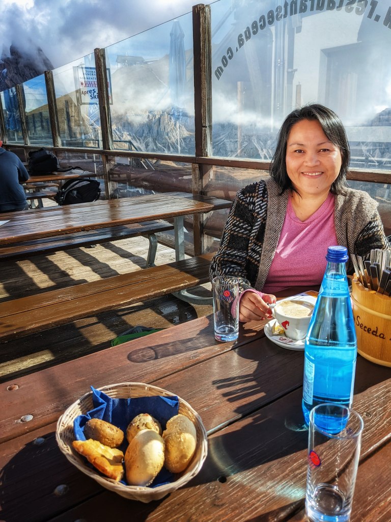 The restaurant at the upper cable car station serves traditional food of the Dolomites and drinks. From the terrace, you have a gorgeous view of the Dolomites while enjoying a good meal after hiking the trail!