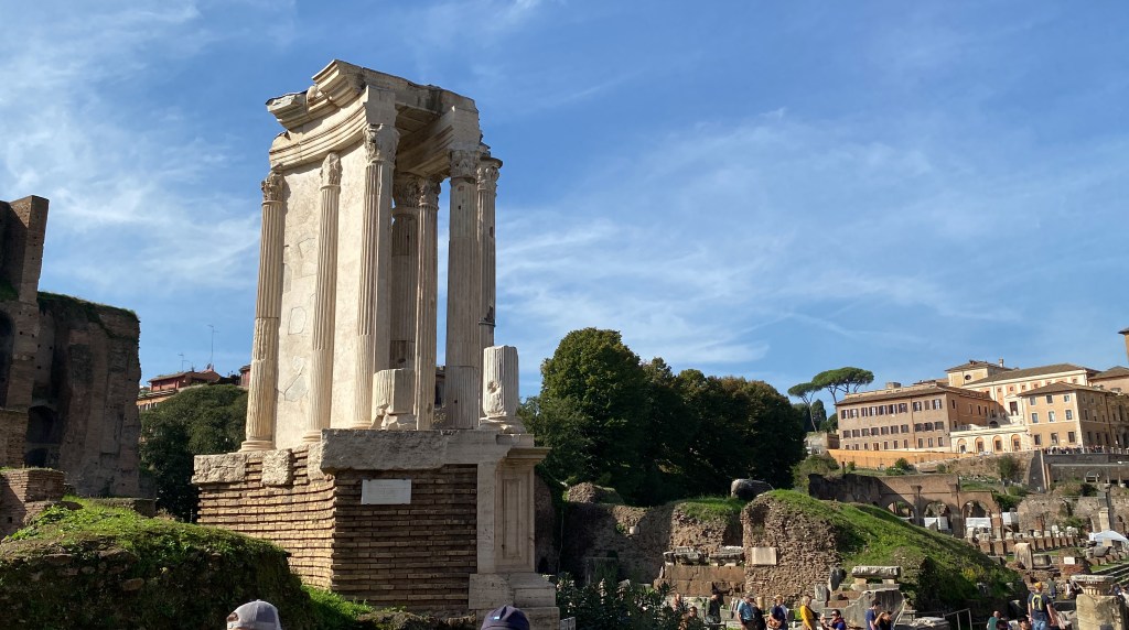 After the Fall of the Western Roman Empire, much of the city of Rome fell into ruin, from famine, warfare, and lack of authority. During the Middle Ages, though the memory of the Forum Romanum persisted, its monuments were for the most part buried under debris, and its location was designated the “Campo Vaccino” or “cattle field,” located between the Capitoline Hill and the Colosseum.