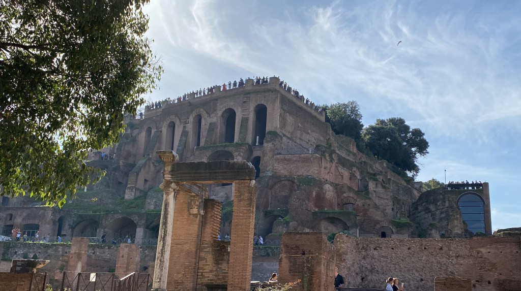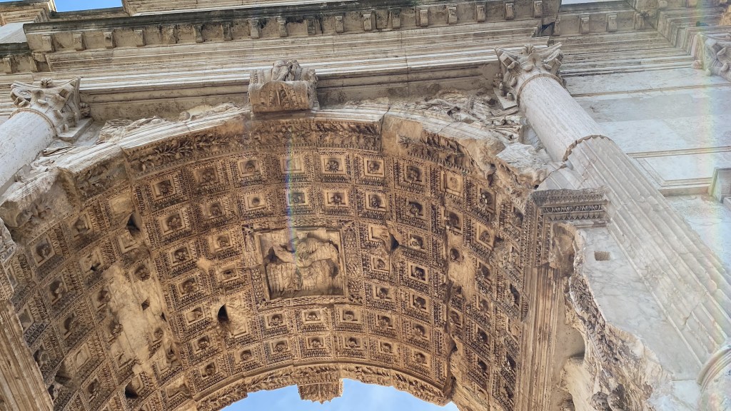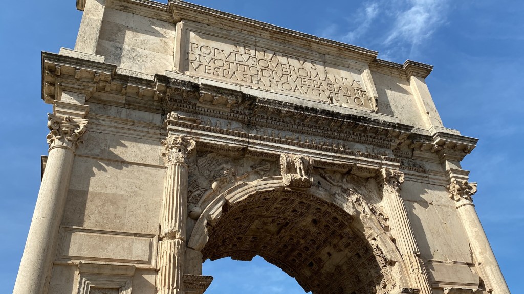 More than a century after Caesar’s assassination, the death of Nero and the rise of the Flavian Dynasty, the Colosseum was built about a mile from the Forum by Emperor Vespasian and opened by his son Emperor Titus. The memorial of Titus was built by his brother, the last emperor of the Flavian Dynasty.