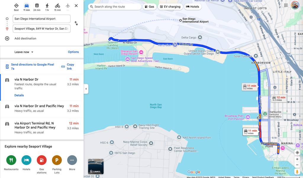 The above map shows the route for a quick and easy trip to the San Diego harbor from the airport. The harbor side shops, restaurants and sculptures are popular with tourists and locals alike.