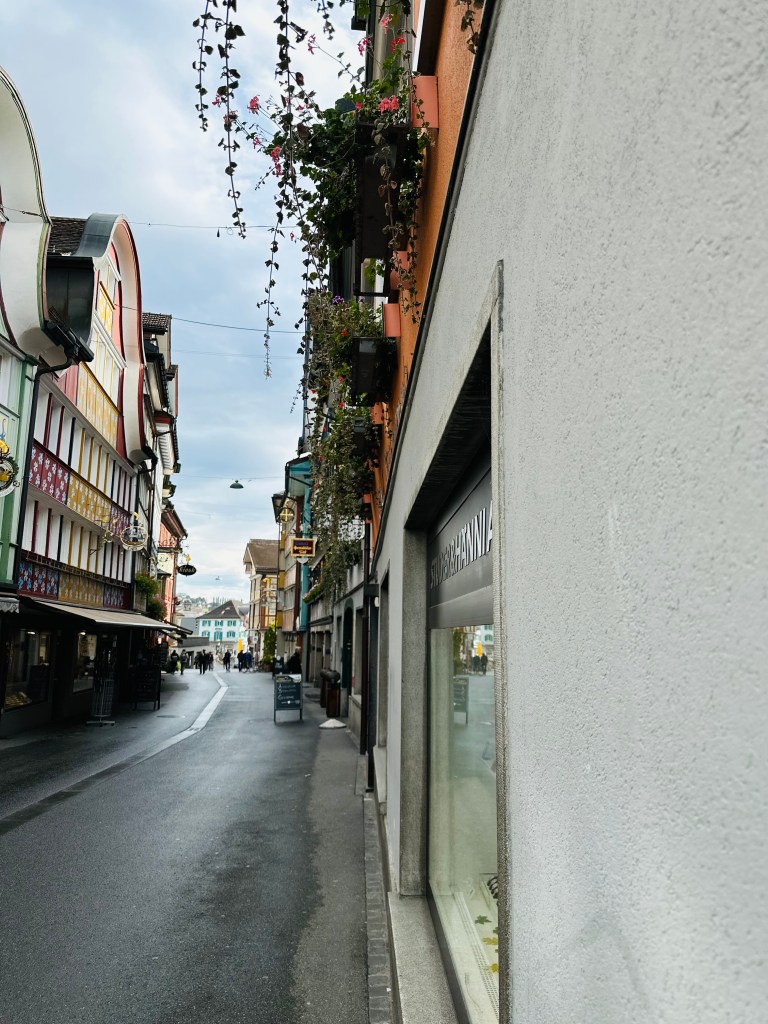 A small miracle of color. Wooden houses painted in cream, sage, and rose; windows bordered in lace. The hills around it were soft and green, like folds of cloth laid over giants. We stopped for coffee and cheese, of course cheese- and watched the locals go about their day in that unhurried way that makes you question your own clock. Autumn suited Appenzell; it carried the season with unselfconscious grace.