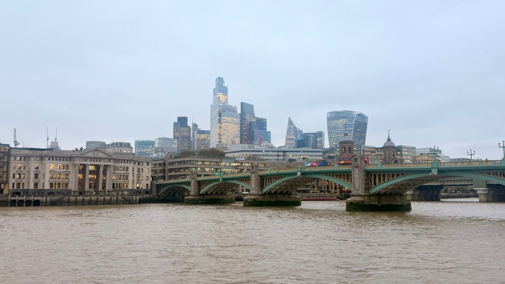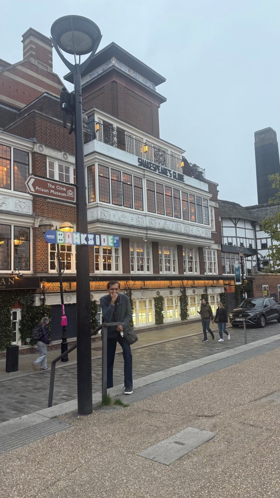 We walked along the South Bank toward the Globe Theatre. It’s a strange-looking building, all white plaster and dark wood, looking like a 16th-century relic dropped into a concrete world. We took some photos in the fading light, shivering as the damp cold started to soak through our clothes.
